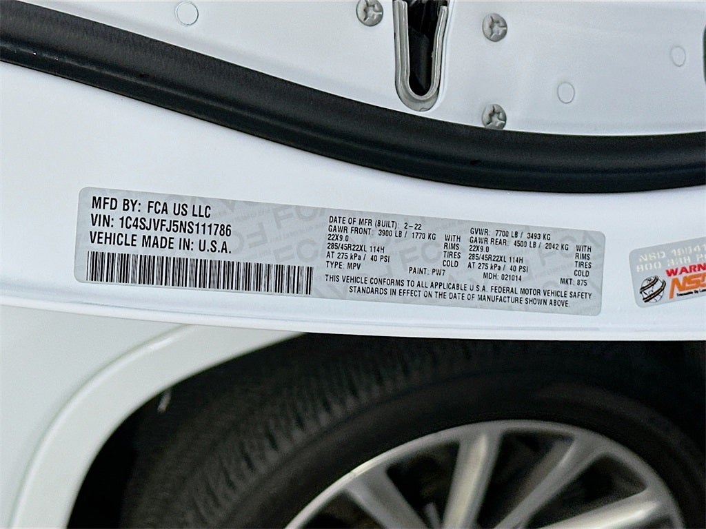 CARFAX One-Owner. 2022 Jeep Grand Wagoneer Series II 6.4L V8 8-Speed Automatic 4WD 4D Sport Utility Bright White Clearcoat Grand Wagoneer Series II, 4D Sport Utility, 6.4L V8, 4WD, Bright White Clearcoat, Blue Agave w/Leather Trimmed Bucket Seats, Active Driving Assist System, Advanced Security Alert System, Convenience Group III, Interior Rear Facing Camera, Intersection Collision Assist System, Navigation System, Night Vision/Pedestrian-Animal Detection, Power Liftgate, Power moonroof, Quick Order Package 23S, Two Tone Paint Group, Wheels: 22 x 9.0 Premium 1 Aluminum, 19 Speakers, 3.92 Rear Axle Ratio, 3rd row seats: bench, 4-Wheel Disc Brakes, ABS brakes, Adjustable pedals, Air Conditioning, Alloy wheels, AM/FM radio: SiriusXM with 360L, Anti-whiplash front head restraints, Audio memory, Auto High-beam Headlights, Auto-dimming door mirrors, Auto-dimming Rear-View mirror, Auto-leveling suspension, Automatic temperature control, Body Color Roof, Brake assist, Bumpers: body-color, Compass, Delay-off headlights, Driver door bin, Driver vanity mirror, Driver's Seat Mounted Armrest, Dual front impact airbags, Dual front side impact airbags, Electronic Stability Control, Four wheel independent suspension, Front anti-roll bar, Front Bucket Seats, Front Center Armrest w/Storage, Front dual zone A/C, Front fog lights, Front Passenger Interactive Display, Front reading lights, Fully automatic headlights, Garage door transmitter, Genuine wood console insert, Genuine wood dashboard insert, Genuine wood door panel insert, Heads-Up Display, Heated door mirrors, Heated front seats, Heated rear seats, Heated steering wheel, Illuminated entry, Knee airbag, Leather steering wheel, Leather Trimmed Bucket Seats, Low tire pressure warning, Memory seat, Normal Duty Suspension, Occupant sensing airbag, Outside temperature display, Overhead airbag, Overhead console, Panic alarm, Passenger door bin, Passenger seat mounted armrest, Passenger vanity mirror, Pedal memory, Power adjustable front head restraints, Power door mirrors, Power driver seat, Power passenger seat, Power steering, Power windows, Radio data system, Radio: Uconnect 5 Nav w/12.0 Display, Rain sensing wipers, Real Wood Interior Accents IV, Rear air conditioning, Rear anti-roll bar, Rear dual zone A/C, Rear reading lights, Rear seat center armrest, Rear window defroster, Rear window wiper, Reclining 3rd row seat, Remote keyless entry, Security system, Speed control, Speed-sensing steering, Speed-Sensitive Wipers, Split folding rear seat, Steering wheel memory, Steering wheel mounted audio controls, Tachometer, Telescoping steering wheel, Tilt steering wheel, Traction control, Trip computer, Turn signal indicator mirrors, Variably intermittent wipers, Ventilated front seats, Voltmeter, Grand Wagoneer Series II, 4D Sport Utility, 6.4L V8, 4WD, Bright White Clearcoat, Blue Agave w/Leather Trimmed Bucket Seats, Active Driving Assist System, Advanced Security Alert System, Convenience Group III, Interior Rear Facing Camera, Intersection Collision Assist System, Navigation System, Night Vision/Pedestrian-Animal Detection, Power Liftgate, Power moonroof, Quick Order Package 23S, Two Tone Paint Group, Wheels: 22 x 9.0 Premium 1 Aluminum. We do things differently at Auffenberg CDJR. Every vehicle is priced to sell and backed by our Auffenberg Honestly Policy. Located at Auffenberg CDJR 1108 Auffenberg Ave. Shiloh, IL. Located at Auffenberg CDJR. 1108 Auffenberg Ave. Shiloh, IL 62269.