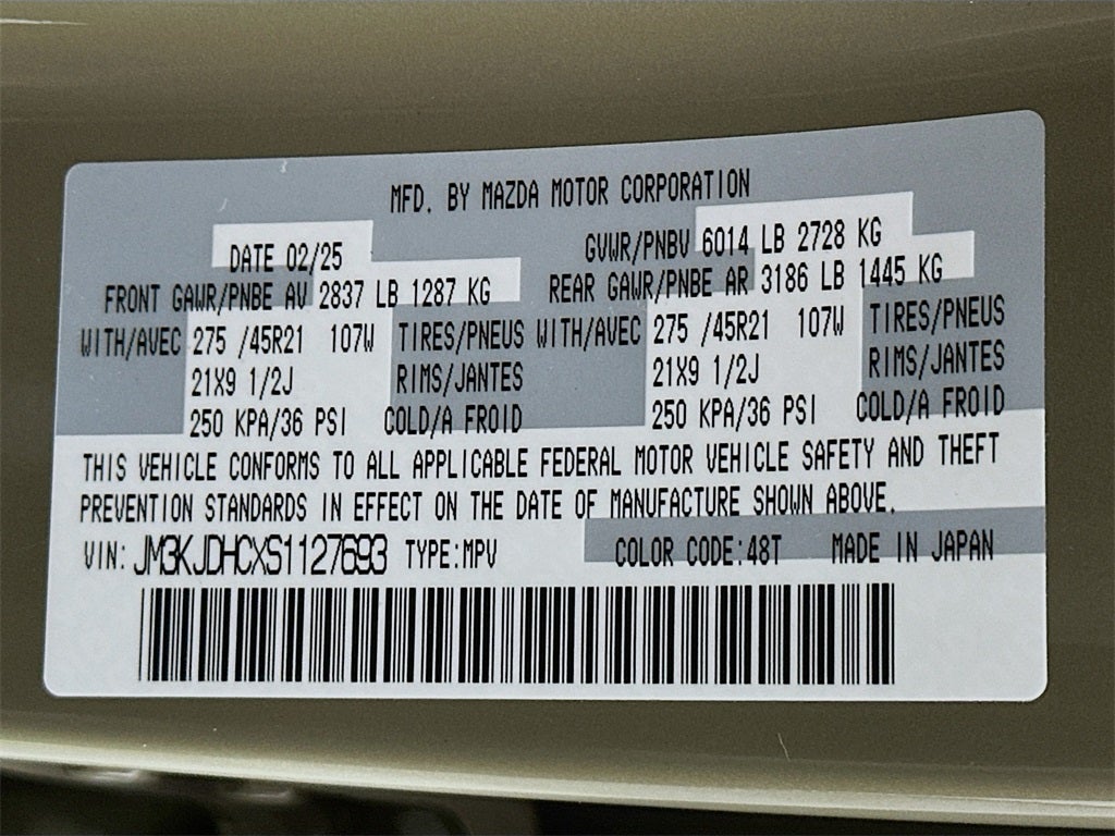 Certified. CARFAX One-Owner. Clean CARFAX. 2025 Mazda CX-70 3.3 Turbo S Premium I6 Turbo 8-Speed Automatic AWD 4D Sport Utility Zircon Sand Metallic 23/28 City/Highway MPG Mazda Certified Pre-Owned Certified, 12 Speakers, 4-Wheel Disc Brakes, ABS brakes, Air Conditioning, Alloy wheels, AM/FM radio: SiriusXM, Auto High-beam Headlights, Auto-dimming door mirrors, Auto-dimming Rear-View mirror, Automatic temperature control, Brake assist, Bumpers: body-color, Compass, Delay-off headlights, Driver door bin, Driver vanity mirror, Dual front impact airbags, Dual front side impact airbags, E911 Automatic Emergency Notification, Electronic Stability Control, Emergency communication system: MAZDA CONNECT, Four wheel independent suspension, Front anti-roll bar, Front Bucket Seats, Front Center Armrest w/Storage, Front dual zone A/C, Front reading lights, Fully automatic headlights, Garage door transmitter: HomeLink, Heads-Up Display, Heated door mirrors, Heated front seats, Heated rear seats, Heated steering wheel, Heated/Ventilated Front Bucket Seats, Illuminated entry, Infotainment System Voice Command, Knee airbag, Leather Shift Knob, Leather steering wheel, Low tire pressure warning, Mazda Connected Services, Mazda Online Navigation, Memory seat, Nappa Leather Seat Trim, Navigation system: MAZDA CONNECT, Occupant sensing airbag, Outside temperature display, Overhead airbag, Overhead console, Pandora Internet Radio Integration, Panic alarm, Passenger door bin, Passenger vanity mirror, Power door mirrors, Power driver seat, Power Liftgate, Power moonroof, Power passenger seat, Power steering, Power windows, Radio Broadcast Data System Program Information, Radio data system, Radio: AM/FM w/Bose Premium Audio Sound System, Rain sensing wipers, Rear air conditioning, Rear anti-roll bar, Rear reading lights, Rear seat center armrest, Rear window defroster, Rear window wiper, Remote keyless entry, Security system, SMS Text Msg Audio Delivery & Reply, Speed control, Speed-sensing steering, Split folding rear seat, Spoiler, Steering wheel memory, Steering wheel mounted audio controls, Tachometer, Telescoping steering wheel, Tilt steering wheel, Traction control, Trip computer, Turn signal indicator mirrors, Variably intermittent wipers, Ventilated front seats, Wheels: 21 x 9.5J Aluminum Alloy. Mazda Certified Pre-Owned Details: